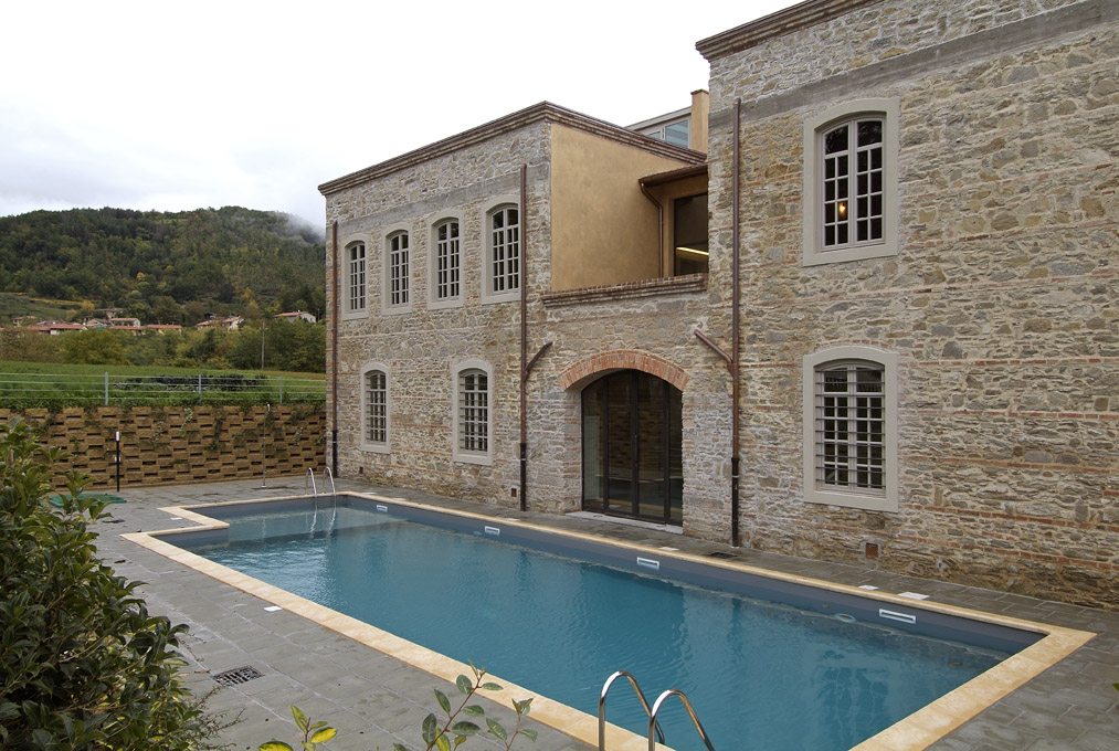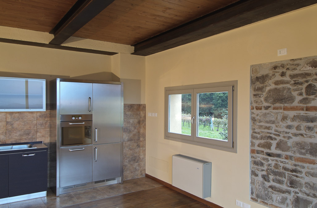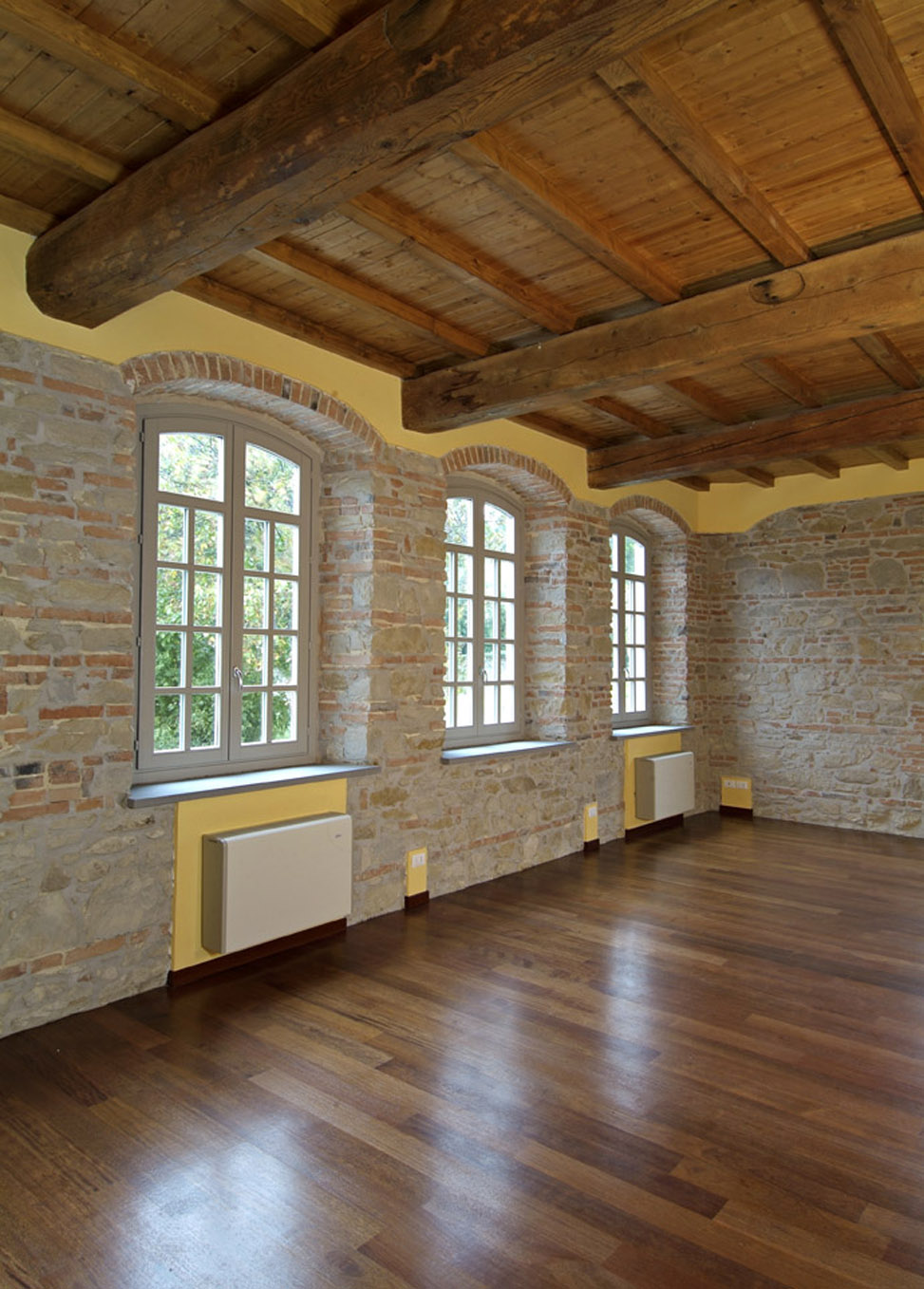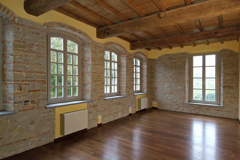 Le finestre in legno lamellare con vetri camera ad alta efficienza energetica garantiscono un eccellente isolamento termico, mentre le porte interne in legno massello sono state personalizzate nei colori e nelle finiture per adattarsi allo stile degli interni. Ogni elemento è stato progettato e montato con la precisione tipica della lavorazione artigianale toscana.